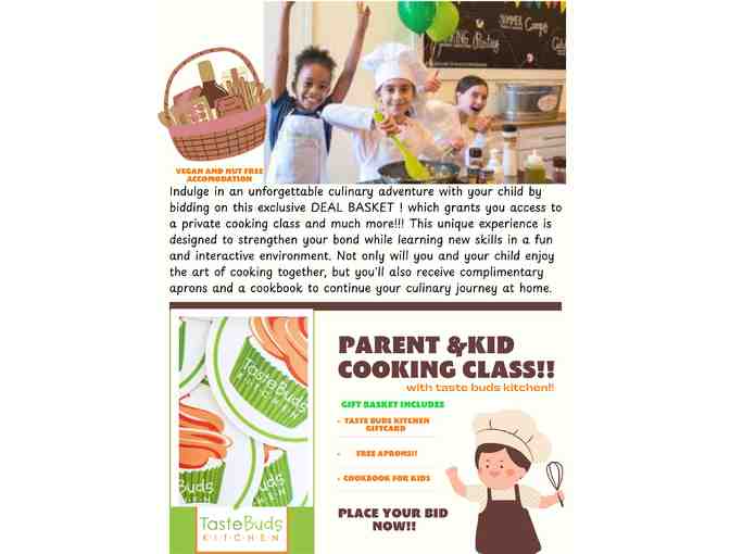 Indulge yourself and your little one in an unforgettable culinary experience by bidding on this exclusive baking basket! It includes a gift card from Taste Buds kitchen worth $100, comfortable apron with pocket for parent and child, and a complete baking book for young chefs with 100+ recipes!