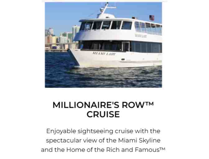 You are bidding on a one pass for two people to take the Millionaire's Row Cruise. Departure location is Bayside Marketplace, Miami, FL.