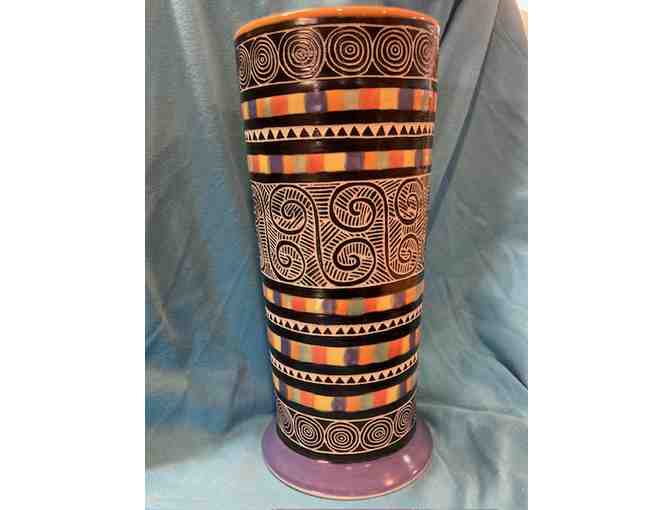 This stunning hand-thrown sgraffito ("scratched") vase measures 10 1/4 inches high. James Guggina is a western Massachusetts artist known for his beautiful, flowing, and intricate designs.