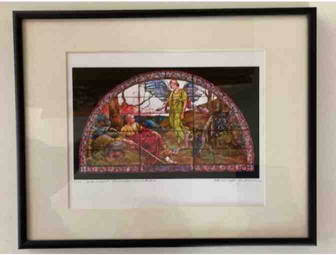 Two 11.5" x 15" colorized photos by Nicole Bernstein of First Church's Pilgrim Window, matted and framed and in very good condition. (One has a couple of scratches on the lower edge of the frame.)