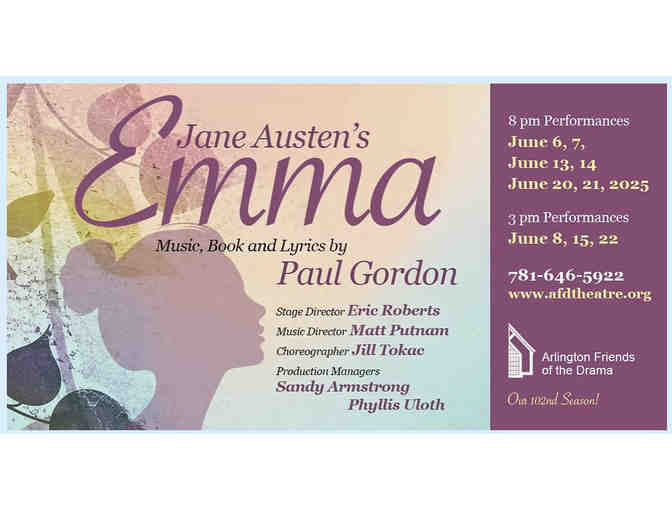 The Arlington Friends of the Drama will present this musical (and modern) version of the Jane Austen classic from June 6 to 22. The winning bidder should contact Clare Livak through the box office (781-646-5922) to order tickets for the performance of their choice.