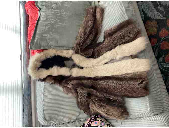 Silver fox fur coat with white rabbit trim, circa 1970. Approximate size M 10.