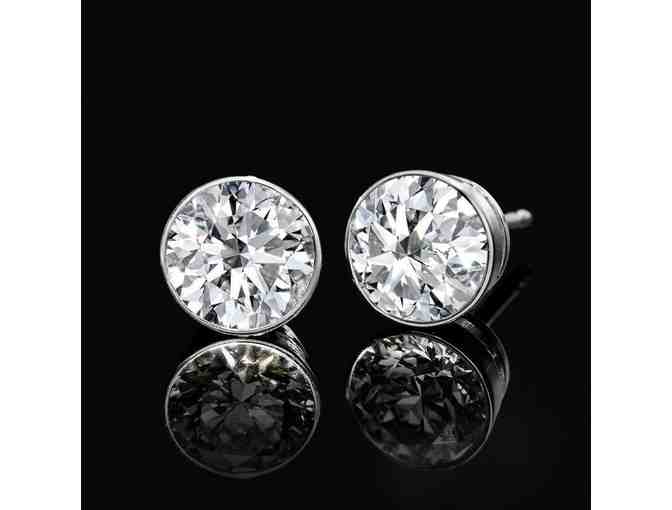 Description: White 14 karat Bezel Set Martini stud CVD lab produced diamond earrings. 2.5 tw round E/F VVV/VS Diamond serial: 3995