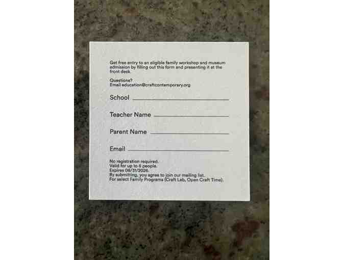 Get free entry to an eligible family workshop and museum admission. No registration required. Valid up to 6 people. Expires 08/31/2026. For select Family Programs (Craft Lab, Open Craft Time).