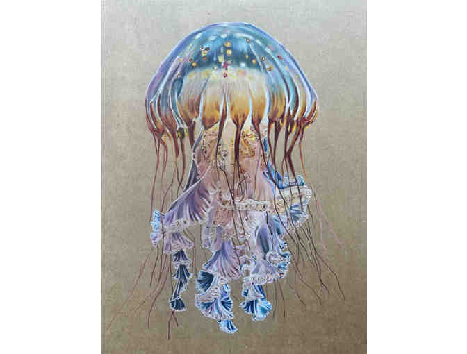 Dive into the depths of the ocean with this captivating original drawing of a jellyfish, brought to life with high quality, fade resistant colored pencil over the course of 25 meticulous hours. This piece blends vivid color, flowing lines, and delicate detail to capture the quiet elegance of one of the sea's most mysterious creatures. Created and donated by a local parent artist, this one-of-a-kind work is framed and ready to display. Its perfect for anyone who appreciates marine life, intricate artwork, and supporting our incredible school community, making this a meaningful and beautiful addition to your home or office.