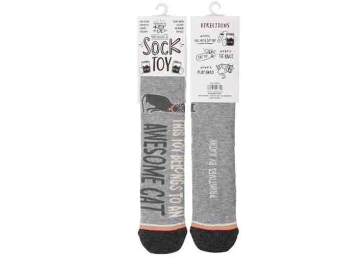 A stuffable cat toy made of a cotton, nylon, and spandex blend (just like our socks!). Features a "This Toy Belongs To An Amazing Cat" sentiment with colorful designs. Fill with included crinkle paper and/or your own catnip, knot the top, and watch your cat go nuts!
