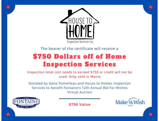 $750 Dollars off Home Inspection Services. Total Cost must exceed $750, only valid in Maine