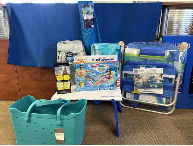 Beach Bundle - 2 Towels, table, chair, umbrella, cooler, suntan lotion, beach bag