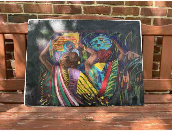 This captivating painting by Minneapolis/St. Paul artist Kenneth C. Green presents a vibrant African village scene rendered in his characteristic acrylic style. A master of diverse media—including watercolor, pen and ink, mosaic, and wood—Green was a prolific and respected figure in the Twin Cities art world, known for blending cultural heritage with expressive modernism.