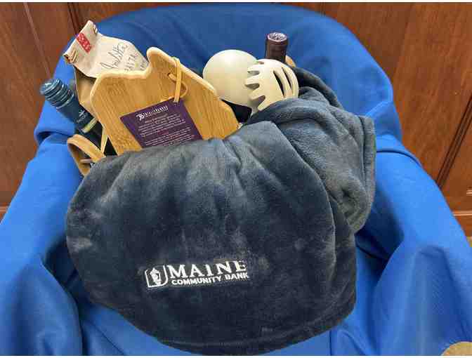 Night In Gift Basket includes - Basket, blanket, 2 bottles of wine, cutting board, pasta, sauce, 2 needhams and 2 kitchen tools for pasta
