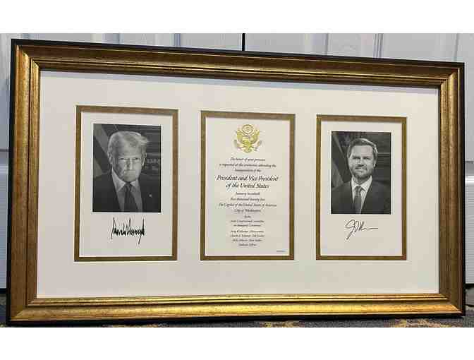 Custom framed, the total size of the piece is 29 15/16 inches by 17 9/16 inches. Matte white and gold coin matting highlight the separate pieces of the invitaion and portraits of President Trump and Vice President Vance.