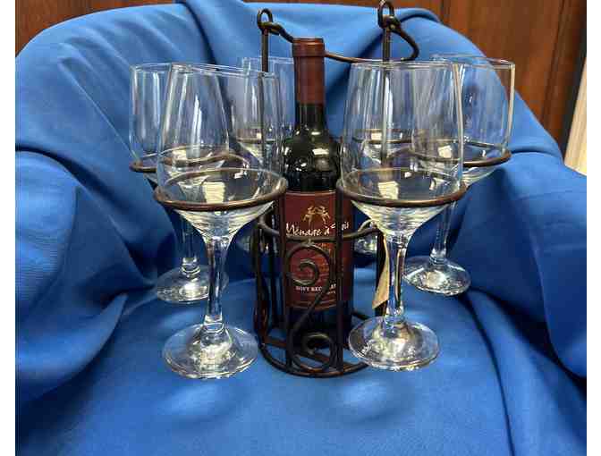 Wine Bottle Caddy, Six Glasses + Bottle of Wine