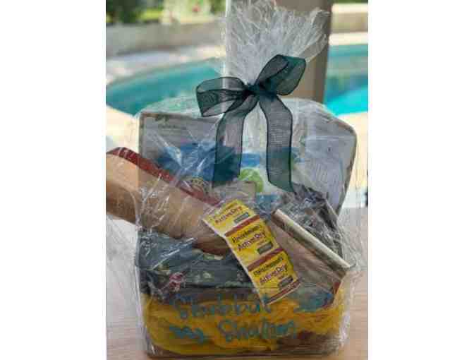Set inlcudes: "Shabbat Shalom" basket, Challah recipe, silicon baking mat, apron, dough cutter, bread flour, yeast, sugar, chocolate chips, sesame seeds and poppy seeds