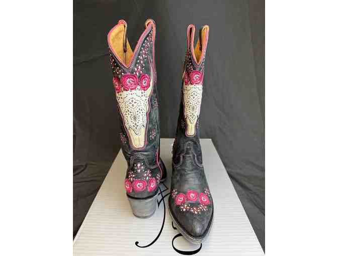 Old Gringo Salma, Black Magenta Ladies Cowboy Boots with longhorn skull overlay and floral embroidery. These stylish 13" tall boots have a 2" stacked heel and snip toe and sturdy pull tabs for easy on/off. The leather upper and leather lining with destressed leather outsole provide amazing comfort and style.