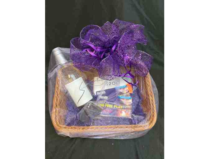 Harrah's Northern California Gift Basket includes bottle of wine (2018 Chenin Blanc, Intercoastal Vineyards, Clarksburg, CA), $200 gift certificate for Louie Oliver's Restaurant and Bar, two (2) $50 Free Play, and a bottle opener.