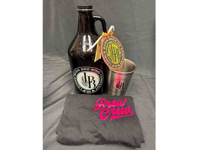 Loomis Basin Brewing Company Gift Basket includes a growler and fill, Brew Crew t-shirt (size M), and a Stainless Steel Cup