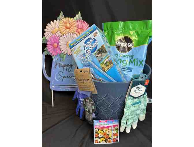 The basket includes a metal ""Happy Spring"" yard sign, 12"" planter (with drain), potting soil, flower seeds (2 packs), gardening gloves (2 pairs) and watering globes.
