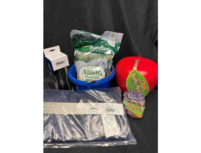 Fabulous horse basket from Chewy includes the following: 81" TuffRider Scrim Horse Fly Sheet in Navy. 5-lb bag of Standlee Forage Bites, 5-lb bag of Alfalfa Banana Horse Treats, 5-lb bag Standlee Forage Bites, Alfalfa Banana Horse Treats, Black Wahl Horse Stiff Body Brush, Black Wahl Horse Stiff Body Brush, Black Horsemen's Pride Jolly Apple Horse Toy, Red Horsemen's Pride Jolly Apple Horse Toy, Red Horsemen's Pride All-Natural Himalayan Salt on a Rope