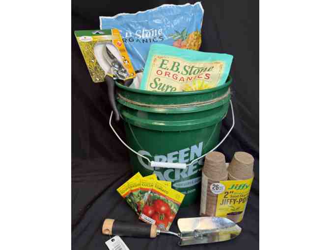 Green Acres Bucket of Garden Supplies includes E.B. Stone Organics Sure Start, E. B. Stone Potting Soil, 26 pack of 2” Jiffy Pots, 4 Seed Packets (Squash, Radish, Cucumber, Tomato) by Lake Valley Seed, Landscapers Select 13" Hand Trowel, Landscapers Select 8” Pruner, and one pair of Gardening Gloves.