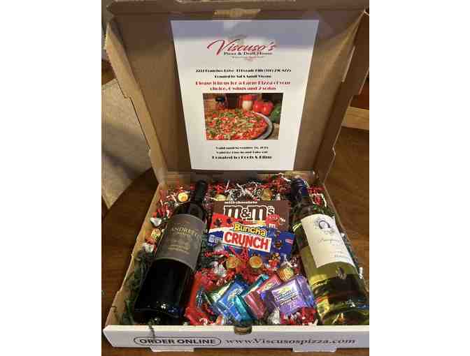 Viscuso's Pizza & Draft House Gift Box includes a Large Pizza of your choice, 6 wings, and 2 sodas for dine in or take out plus 2 bottles of wine and assorted candies!