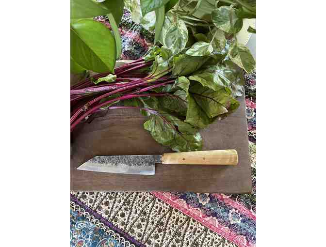 This beautiful hand-forged Japanese-style kitchen utility knife was made by Chris McFee. The blade is differentially hardened with a visible temper line on the polished edge portion, contrasting with the rustic hammered finish along the spine. A west coast Myrtlewood handle is attached with copper fittings. The overall length is twelve inches.