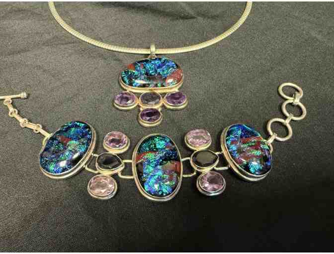 Sterling silver necklace, pendent with matching bracelet with black and blue precious stones.