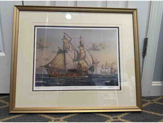 The Ship "Good Fortune" is beautifully captured in this numbered print (print 190 of 950) by Mark R. Myers. It is framed and matted and measures 22"x18.5" On the back is an article that tells the history of the "Good Fortune."