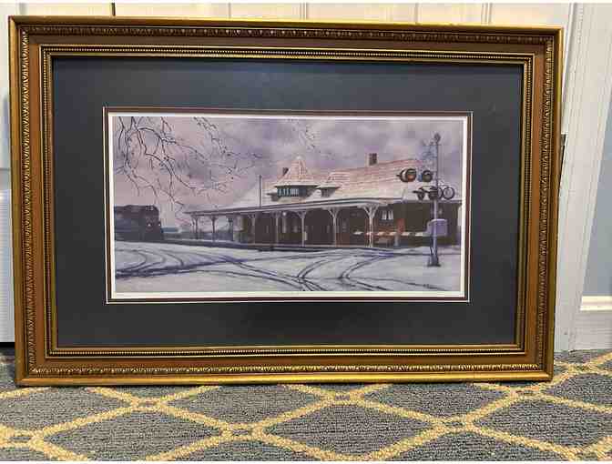 This beautifully framed and matted picture shows a train just pulling into a station on a snowy day. On the back is additional information and a Certificate of Authenticity. #106/525