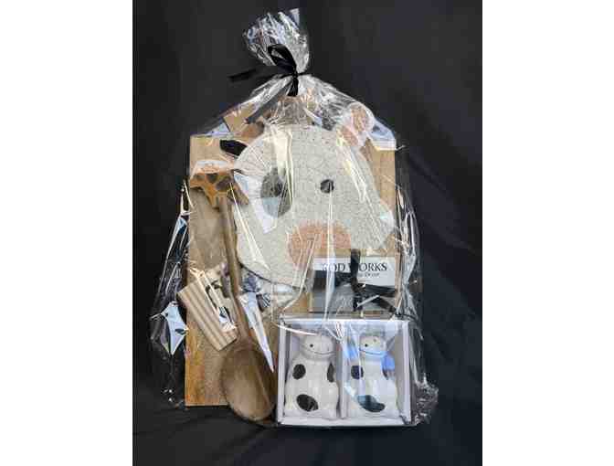 Rod Works Folsom Gift Basket includes a Charcuterie Board, cow pot holder, magnet, spoon, salt & pepper, and $30 gift card