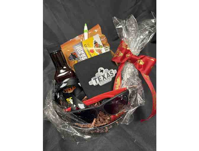 Gift basket from Texas Roadhouse includes $30 voucher for a dinner for two, a bottle of sauce, a bag of peanuts, sunglasses, and a coozie.
