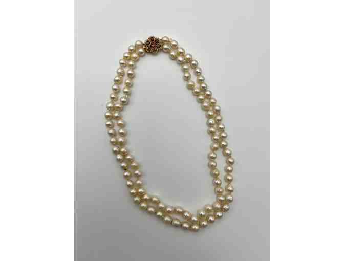 Vintage baroque pearl necklace with 14k gold clasp embellished with rubies