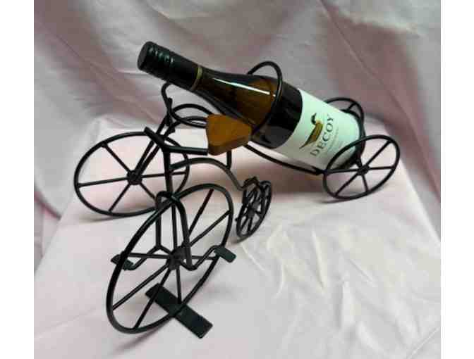 Two (2) old-style decorative metal bicycles, one is a bottle holder designed to hold a single bottle of wine. Pieces are metal with an antique bronze powder coating and shaped like a vintage bicycle.