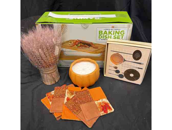Bring the warmth of fall into your home with this cozy kitchen-themed gift set. Perfect for the home chef or host, this bundle includes a 2-piece rectangular baking dish set with bamboo lids for easy prep and storage, a rustic dried wheat bouquet to add a touch of harvest charm, and a festive pumpkin-shaped candle for seasonal ambiance. Also included are a charming set of fall-themed patchwork coasters and a set of decorative kitchen wall art prints. A tasteful and practical addition to any kitchen this season! Six (6) piece hand sewn coasters, fall autumn leaves