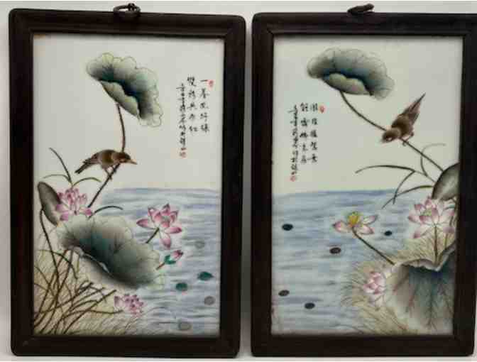 Pair of Chinese Antique 'Famille Rose' Framed Porcelain Panels with Bird