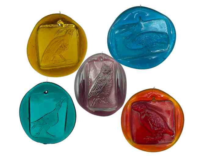 Set of 5 colorful glass folk art suncatchers with images of birds to hang in a sunny window