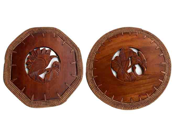 Two plaques with images of birds, carved of teakwood with rattan border from Indonesia