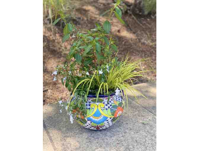 Brighten up your porch, patio, or garden with this vibrant hand-painted Talavera-style ceramic planter, generously donated by Emerisa Gardens. Overflowing with a cheerful mix of annuals—including ornamental grass, white lobelia, and other blooming favorites—this one-of-a-kind arrangement brings a splash of color and charm to any outdoor space.