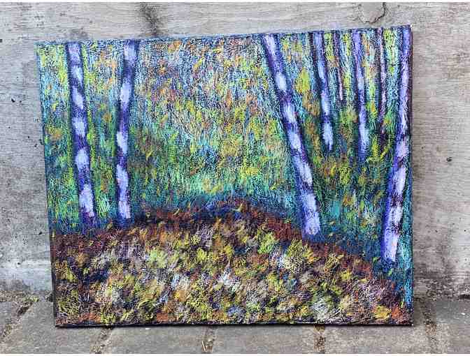 Step into a dreamscape of color and light with Magical Forest by Zak Zaikine. This vibrant, textural painting captures the wonder and mystery of a forest bathed in shifting hues of blue, violet, green, and gold. Bold, expressive strokes and rich layers of pigment invite the viewer to wander into an enchanted woodland where birch trees glow with otherworldly light.