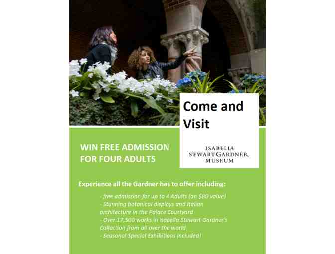 Four adult tickets to the Isabella Stewart Gardner Museum including access to botanical displays, architecture, access to art, and seasonal displays