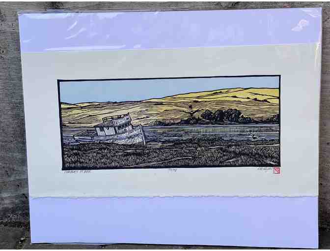 Bring the quiet magic of the Northern California coast into your home with Tomales at Dusk, a stunning hand-pulled linocut print by renowned artist Rik Olson. This evocative piece captures the iconic, weathered fishing boat resting along the shoreline, backdropped by the golden hills of Tomales Bay at sunset. The warm palette and intricate linework reflect Olson’s masterful craftsmanship and deep connection to the local landscape.