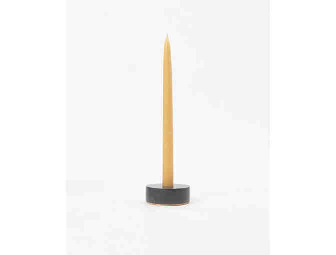 Geometric shapes cut from black marble create beautifully simple stone candle holders. Finished with a hand stamped leather bottom to protect any table surface from scratches.