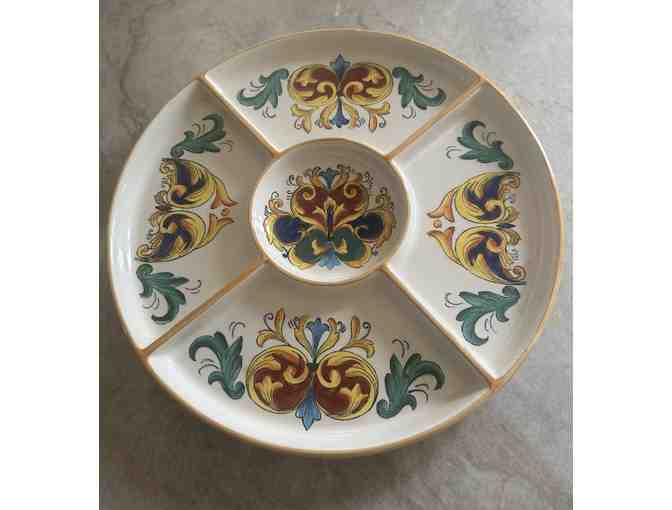 This large sectioned decorative serving platter is a beautiful addition to any kitchen. With a colorful pattern and five compartments, it is perfect for serving snacks or appetizers during all occasions.
