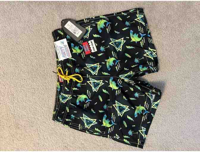 This item is a BLACK SWIM SUIT, with blue, yellow, green designs - Size ADULT MEDIUM.  It's a NEW "Party Sharks" brand Bathing Suit / Swim Trunks.  (Called "Neon Sharks".)  Quick-dry technology, mesh lining, rear pocket with adhesive velcro to keep closed.  Available for nationwide bidding.  Item can be shipped to Winning Bidder or picked up for FREE in Enfield, CT after the Auction.  Fun style, great fit!