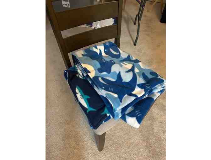 Handmade and REVERSIBLE: with 2 SHARK Patterns (different style of SHARKS on each side). (Noite: There are 2 different "Shark Blankets" in this Auction, of different sizes and colors.) This is a super-soft and cuddly Fleece Throw Blanket, Large Size (66" x 54"). Warm and cozy, reversible design, several different shades of blue. Created by Emmalee Eng, Animal Handler at Riverside Reptiles, especially for our "Shark Auction". This item can be shipped nationwide to Winning Bidder (with insurance) or picked up for FREE in Enfield, CT after the Auction. Please see photos (of the two different reversible "Shark Patterns" on each side).