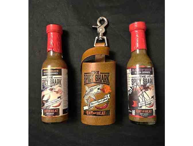 Hottest HOT Sauce, Ever! (So hot that it comes with its own "Hot Sauce Holster"!) "The Spicy Shark" is one of our favorite companies: the product tastes amazing and their Sales support Shark Conservation. This Auction item contains (3) Parts: TWO 5oz glass bottles of Spicy Shark's NEWEST 6-Fin Flavors "Mako Snake" and "Blacktip Widow" AND the unique Spicy Shark Sauce Holster. "Mako Snake" is from masala-style Ghost Pepper while "Blacktip Widow" is from Birdseye Pepper (a combination of Ghost Pepper and Carolina Reaper). Wow! Item can be shipped nationwide to Winning Bidder (with insurance) or picked up for FREE in Enfield, Connecticut after the Auction.