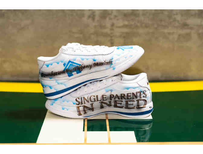 These shoes highlight S.P.I.N Haven,Tiffany Mitchell's foundation, based in her hometown of Charlotte, aimed to provide support and resources for single parents. She has been passionate about this specific piece of life, being that she is a product of a single-parent home.