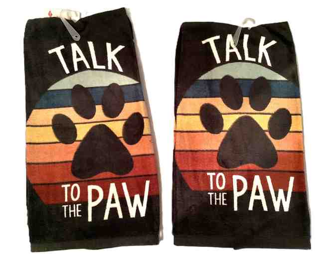 Two quality 100 percent cotton kitchen towels by Ritz. Talk to the Paw. Soft velour print on one side and white terry loops on reverse side.