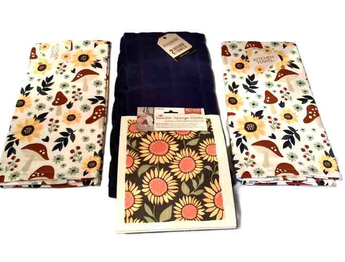Set of four nice quality 100 percent cotton kitchen towels and two pack of Swedish dish cloths. Set includes two mushroom/sunflower print and two navy blue terry towels by Ritz.