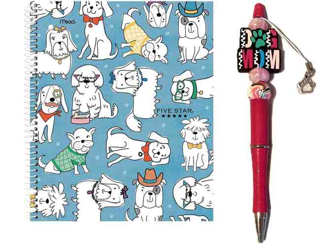 Fun handcrafted 6 inch tall Dog Mom pen. The ink color is black and the pen comes with an ink refill. Barrel of pen is sparkly dark pink. Includes a Five Star notebook with 80 double-sided, wide ruled sheets that fight ink bleed and are perforated for easy tear out. Sheets measure 8 x 10 ½ inch when torn out. Features front pockets to hold loose sheets.