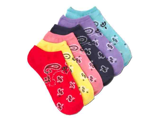 Colorful no show socks in bandana print. Fits shoe size 4-9. 69 percent acrylic, 28 percent polyester, 3 percent spandex.